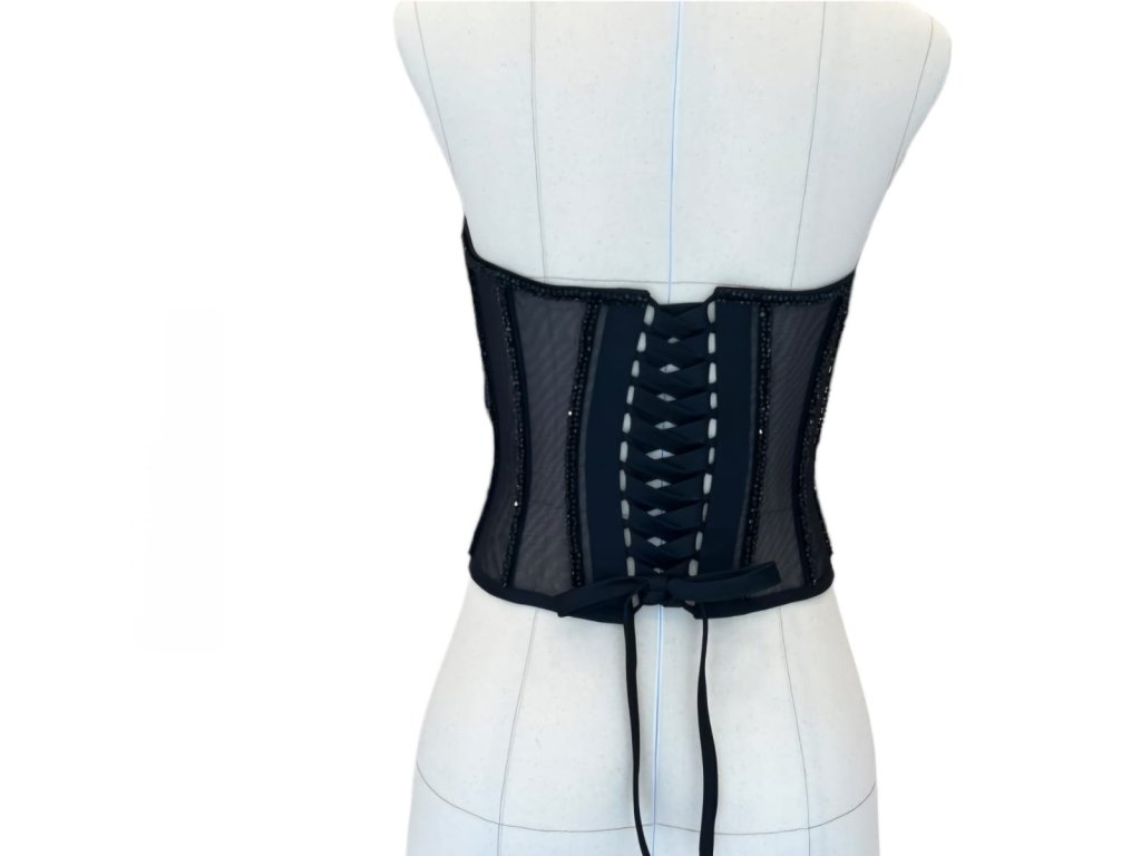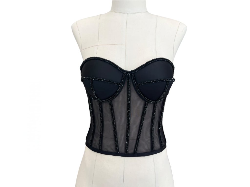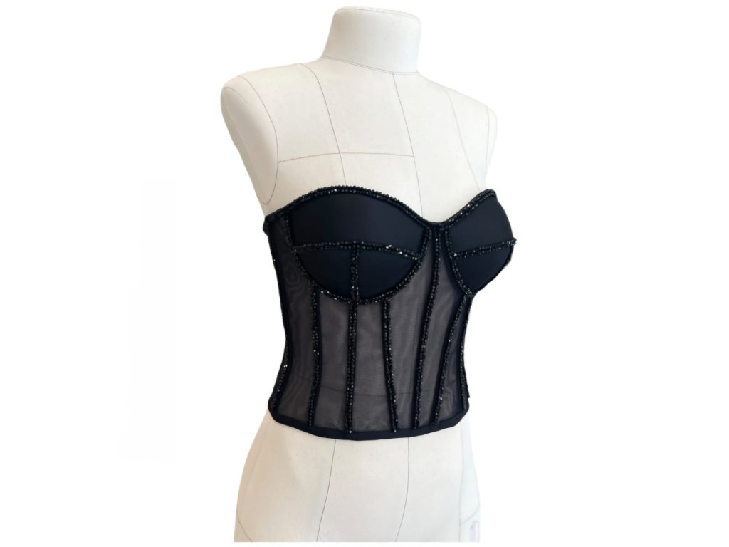 Tvarovaný korzetový top, ručně zdobený černými křišťálovými korálky, které mu dodávají nádherný třpyt a eleganci. Ideální pro ty, kteří chtějí zazářit při jakékoli příležitosti.