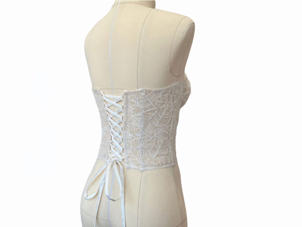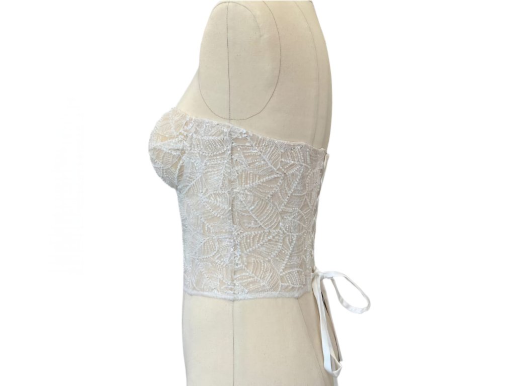 Korzet je ušitý ze speciálního tylu, vyztužený kosticemi, které pomáhají ke správnému držení těla a vytvarování ženské siluety. Korzet ručně zdobený luxusní krajkou v barvě ivory se vzorem listu. Vzadu naleznete klasické šněrování v barvě ivory se saténovou stuhou. Korzet se dokonale hodí pro svatební a společenské šaty. Stačí došít sukni a šaty jsou hotové.