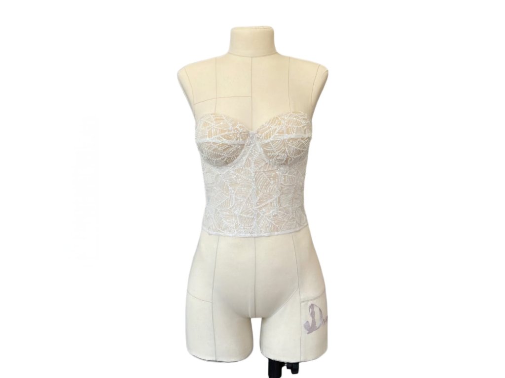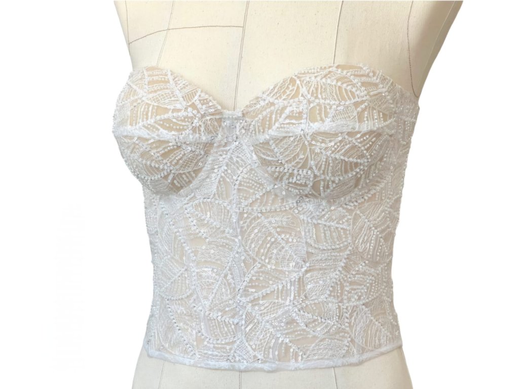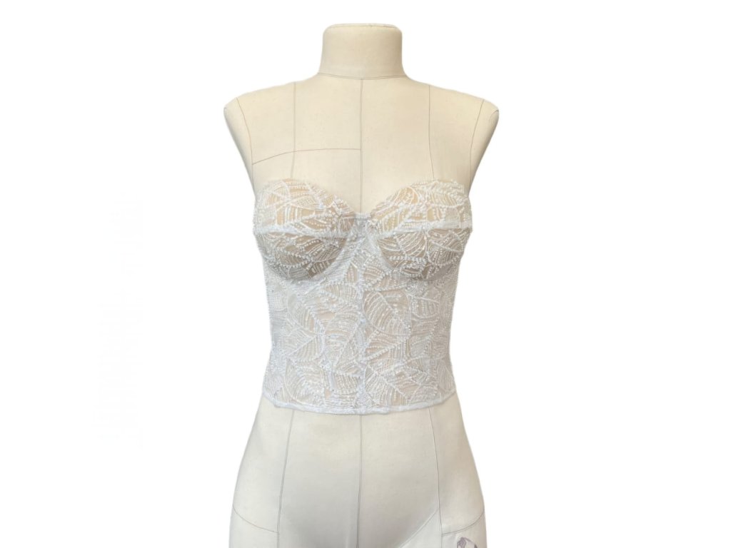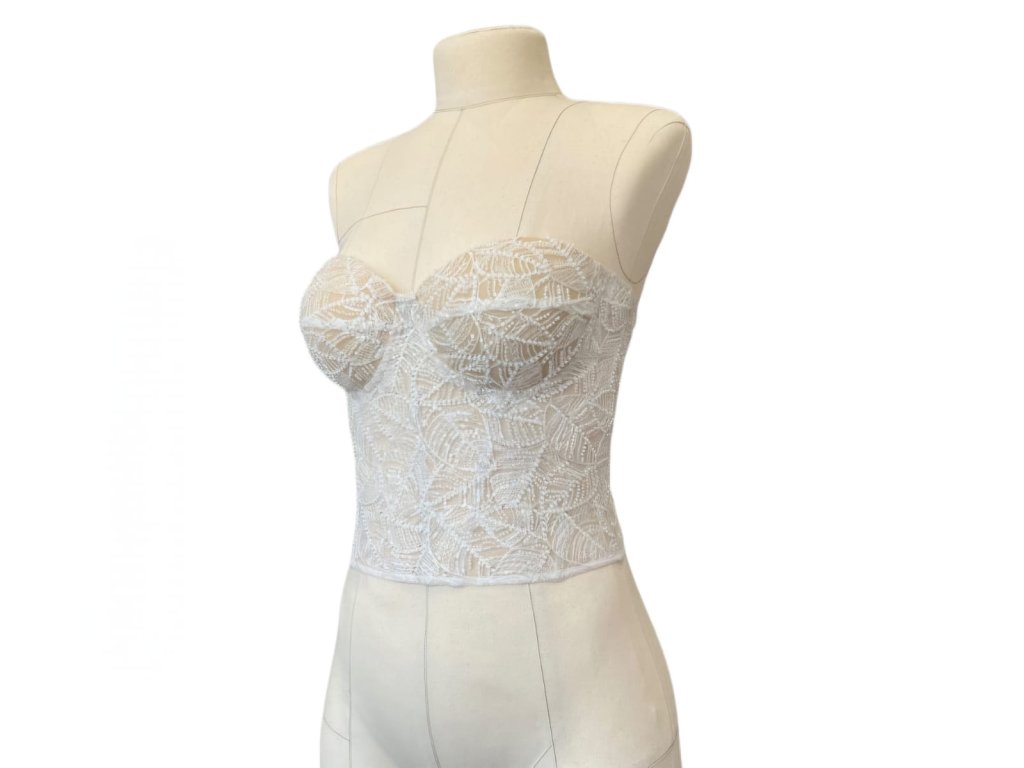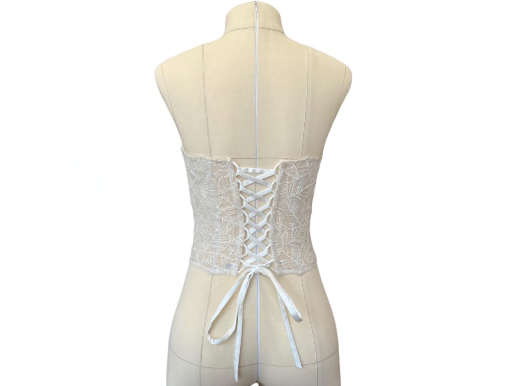 Tylový korzet v barvě ivory, zdobený romantickou krajkou se vzorem lístečků. Krajka na korzetu je velmi kvalitní, zdobená korálky a průhlednými flitry.