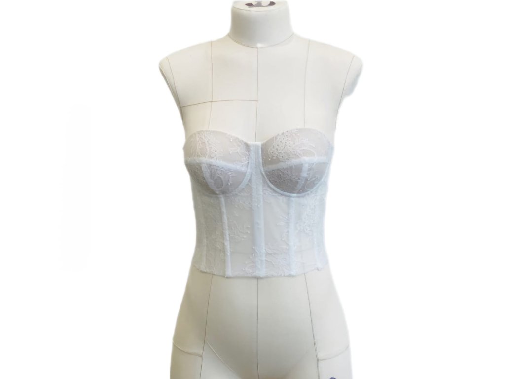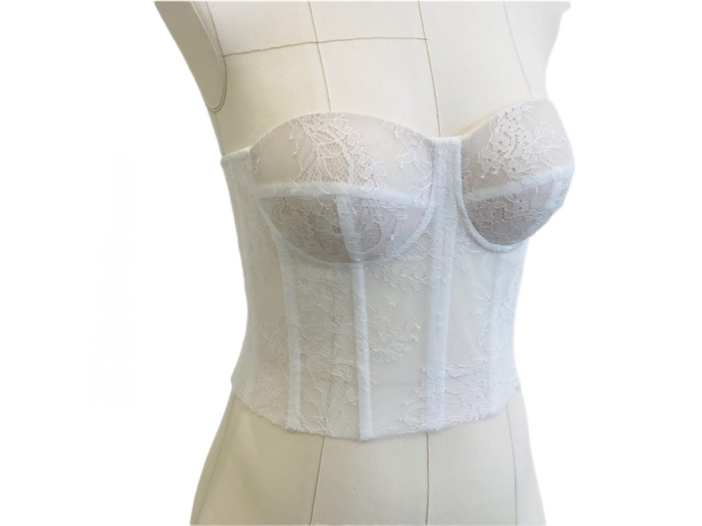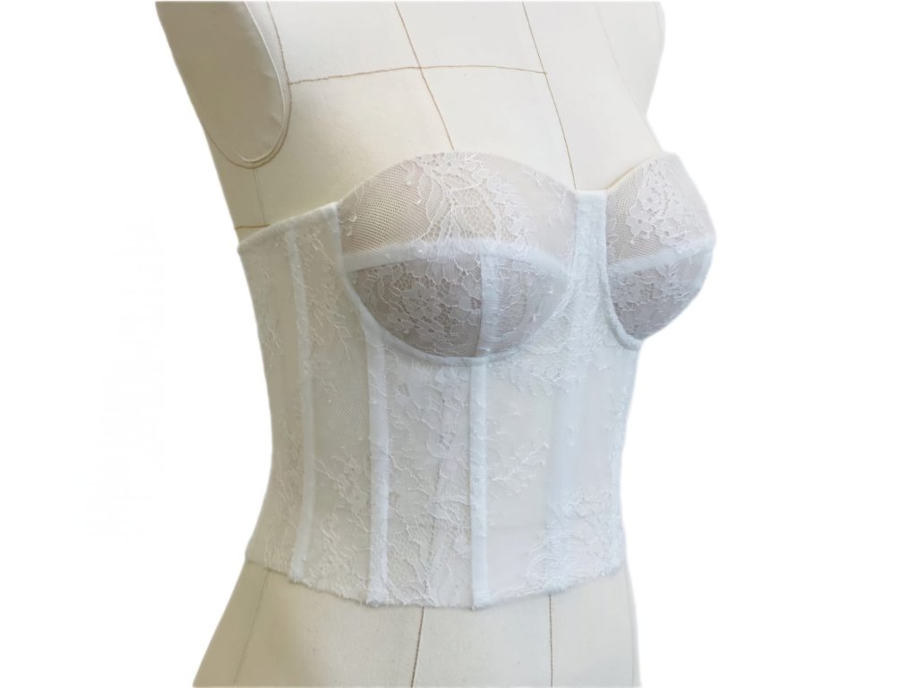 Moderní korzet je ušitý ze speciálního tylu, zdobený jemnou krajkou francouzského typu s květinovým motivem.