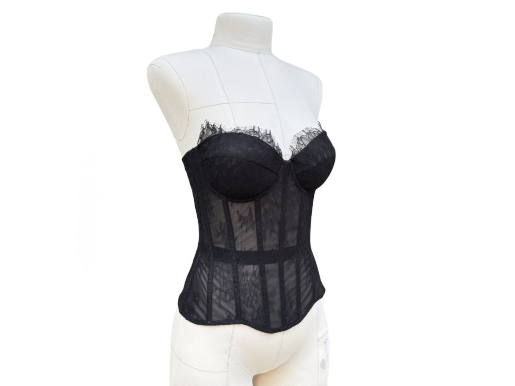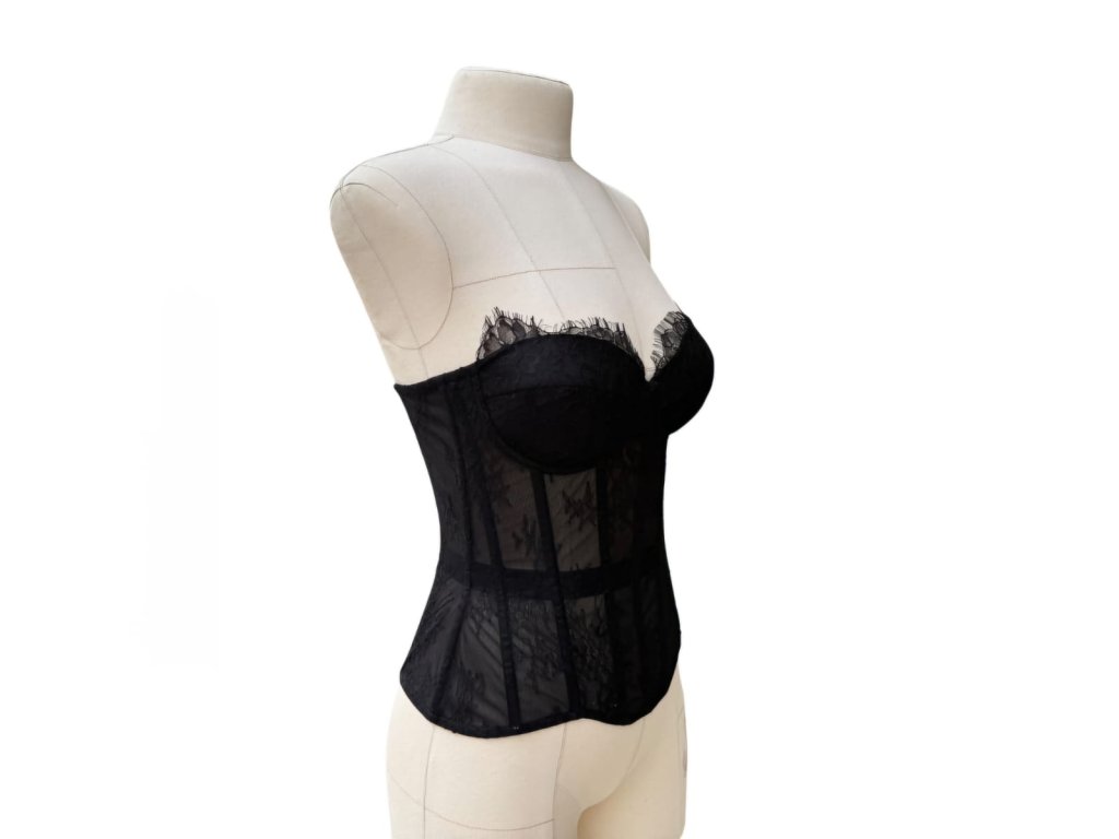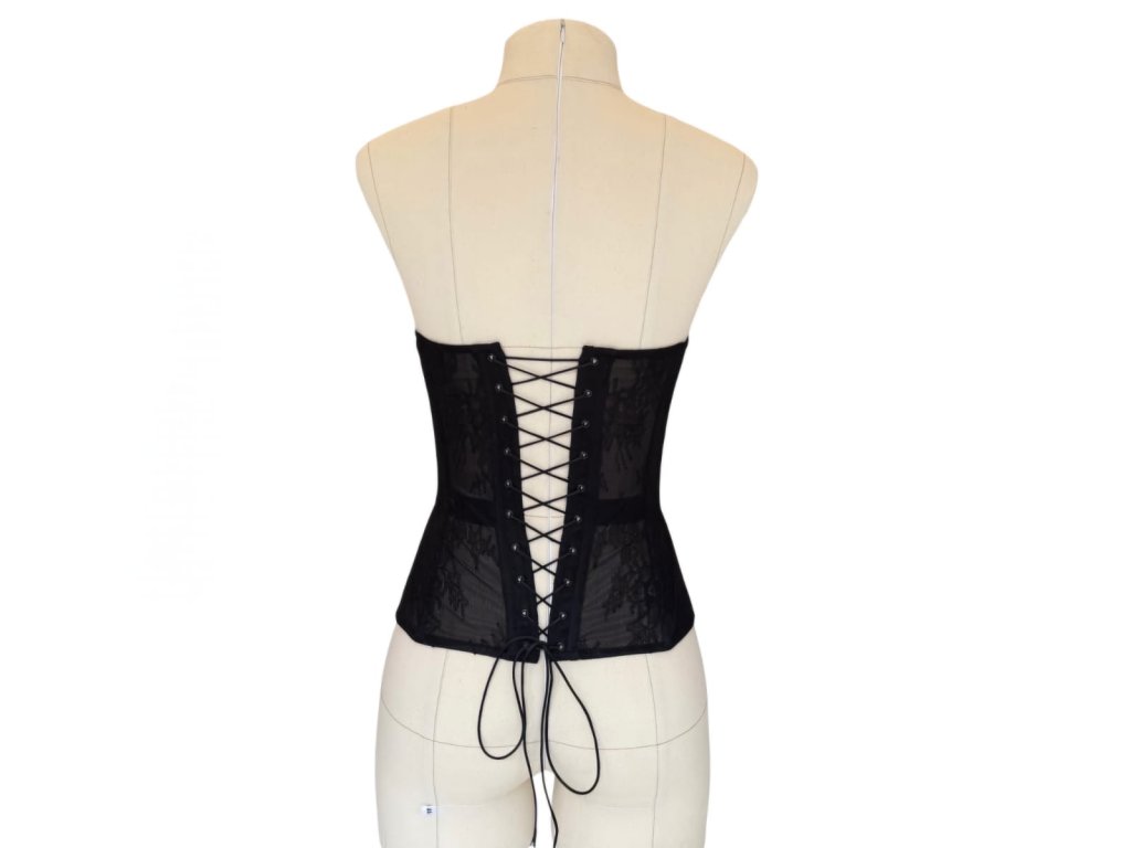 Napůl průhledný korzet v černé barvě . Korzet je ušitý ze speciálního tylu, zdobený jemnou krajkou francouzského typu s květinovým motivem, je vyztužený kosticemi, které vypomáhají ke správnému držení těla a vytvarovaní ženské siluety. Šněrovaní na zadním díle korzetu, koriguje šíři. Tento černý korzet můžete kombinovat se sukní, kalhotami nebo nosit pod sako. Skvělý základ pro tvorbu originálního večerního či svatebního outfitu.