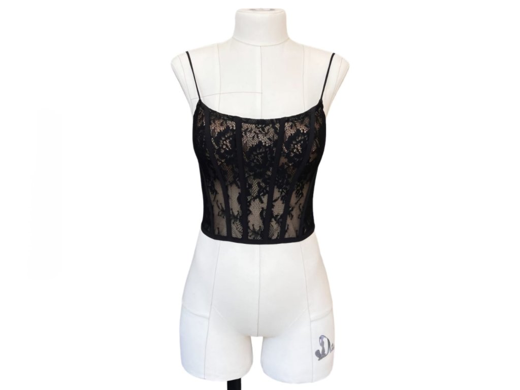 Krásný elegantní černý top ušitý z černé krajky s květinovým vzorem na úzká ramínka.