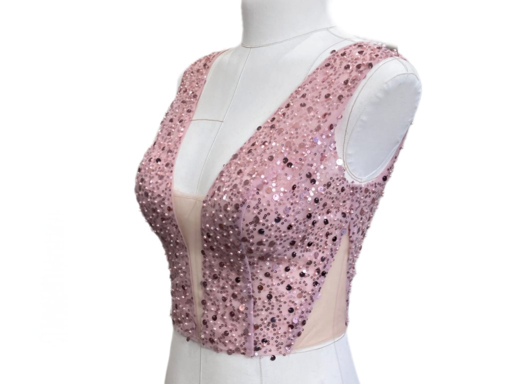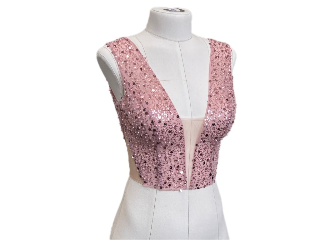 Korzet je ušitý ze speciálního tělového tylu, vyztužený kosticemi, které pomáhají ke správnému držení těla a vytvarování ženské siluety. Korzet ručně zdobený luxusní krajkou v pudrové barvě s korálky a flitry, díky kterým korzet se nádherné třpytí. Šněrovaní na zadním díle korzetu koriguje šíři. Tělové průhledné vsadky po stranách dodávají originální vzhled. Korzet se dokonale hodí pro svatební a společenské šaty. Stačí došít sukni a šaty jsou hotové.