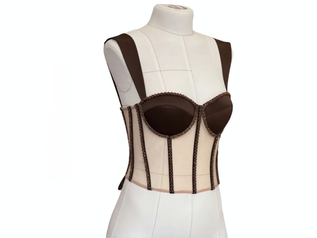 Korzetový je ušitý ze speciálního tylu v barvě latte, vyztužený kosticemi, které pomáhají ke správnému držení těla a vytvarování ženské siluety. Korzetový top ručně zdobený korálky v hnědě barvě. V zadním díle nalezneme klasické šněrování hnědou saténovou stuhou. Topy nikdy nevyjdou z módy. Tento pohodlný a nádherný kousek oceníte pro jakoukoliv příležitost, můžete nosit k sukni nebo ke kalhotám. Tento korzetový top Vám také rádi ušijeme na míru, v této nebo jakékoli jiné barvě.
