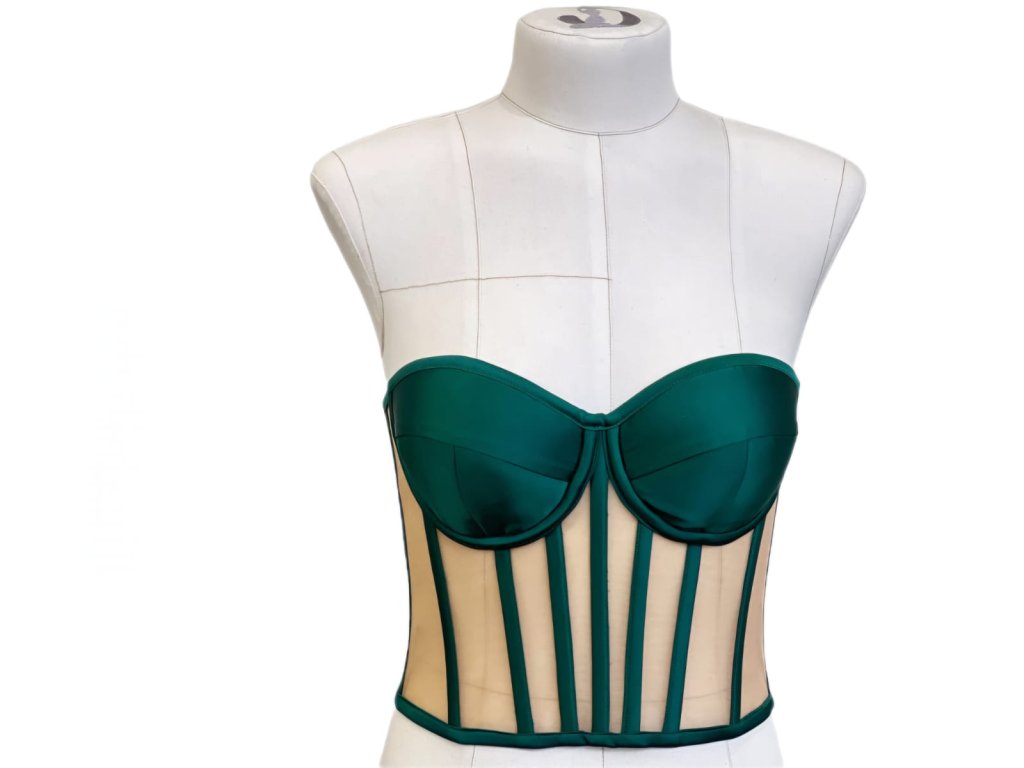 Korzetový top je ušitý ze speciálního tylu, vyztužený kosticemi, které pomáhají ke správnému držení těla a vytvarování ženské siluety. Podprsenkové košíčky a tunýlek potažený saténem smaragdové barvy. Šněrovaní na zadním díle korzetu, koriguje šíři.