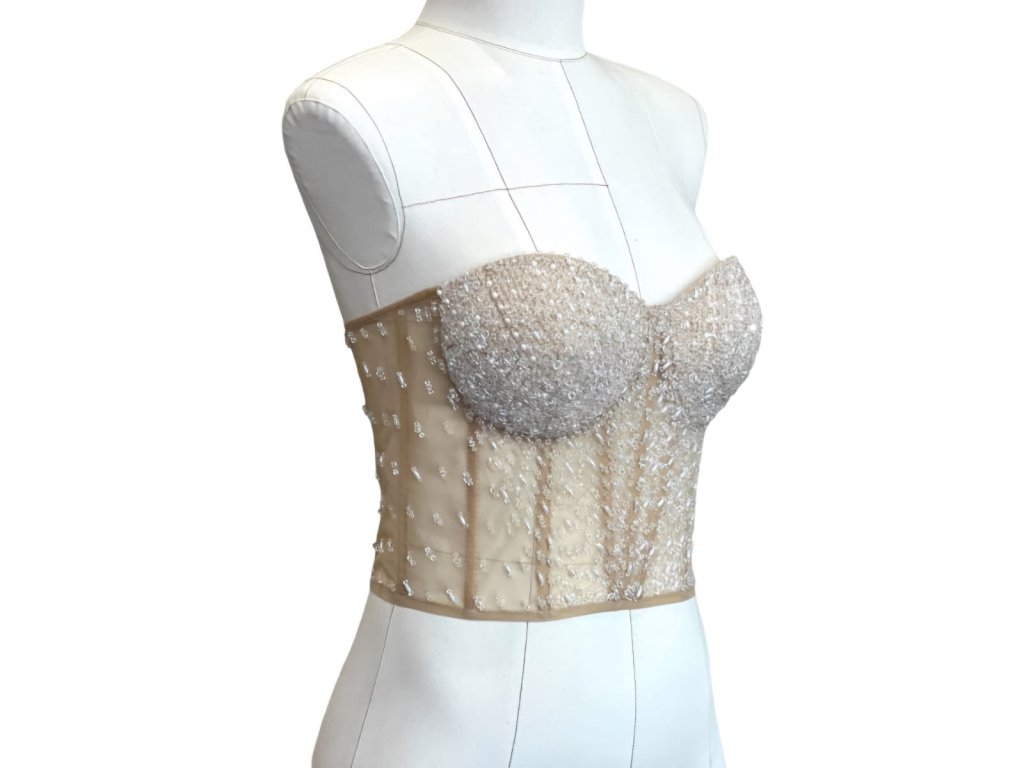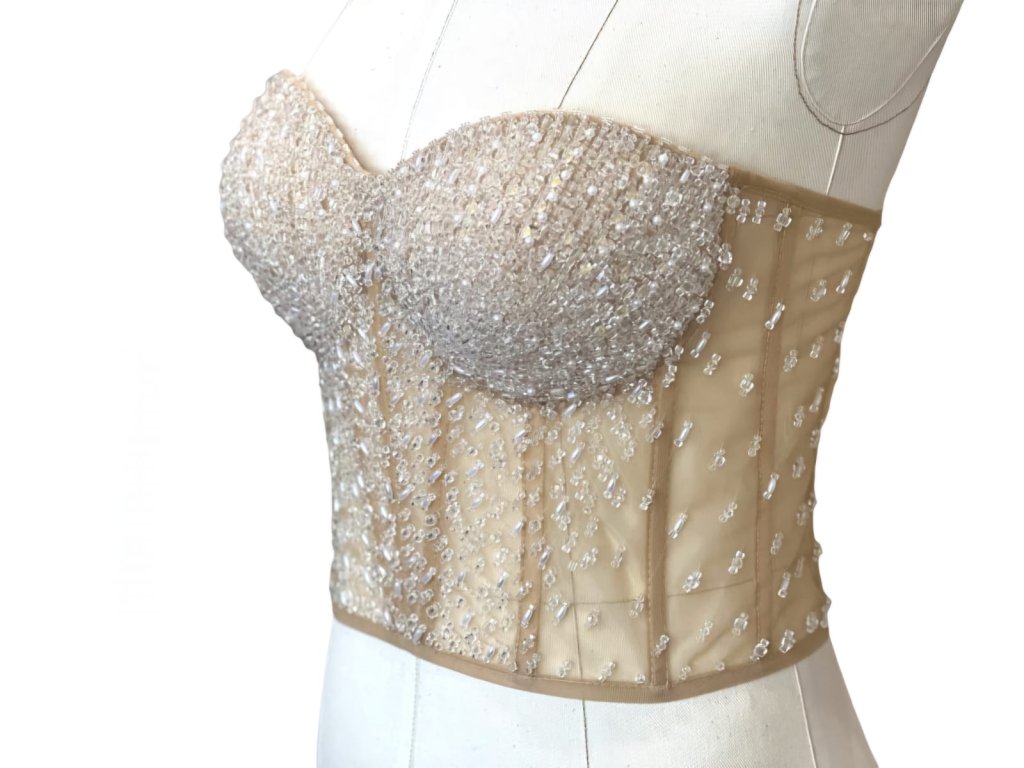 Luxusní korzetový top v tělové barvě, bohatě zdobený průhlednými korálky. Díky preciznímu střihu, kvalitnímu materiálu a důrazu na detail působí luxusně a sofistikovaně – ideální volba pro speciální příležitosti i výrazný prvek každodenního stylu.