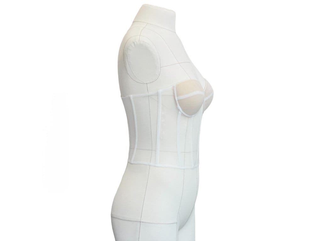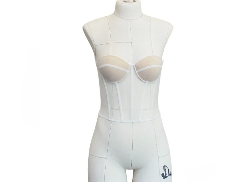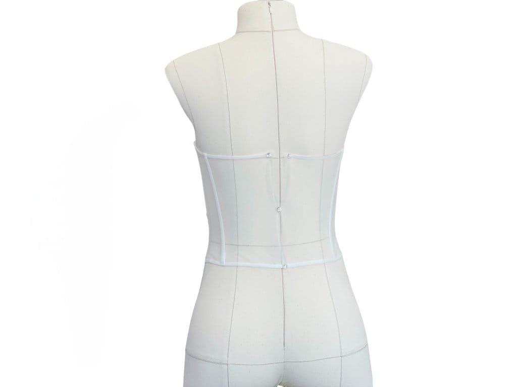 Tylový korzet v ivory barvě. Korzet je ušitý ze speciálního pružného tylu, je vyztužený kosticemi, které vypomáhají, ke správnému držení těla a vytvarovaní ženské siluety. Vzhledem k tomu, že korzet je polotovar, zadní díl je bez zapínání, na zadním díle je tyl připraven ke všití skrytého zipu nebo korzetových poutek dle vašich preferencí. Předchystaný korzet, který Vám ušetří spoustu času, dokonale se hodí pro společenské šaty, pro luxusnější vzhled doporučujeme ozdobit krajkou nebo krajkovou aplikací či kamínky...