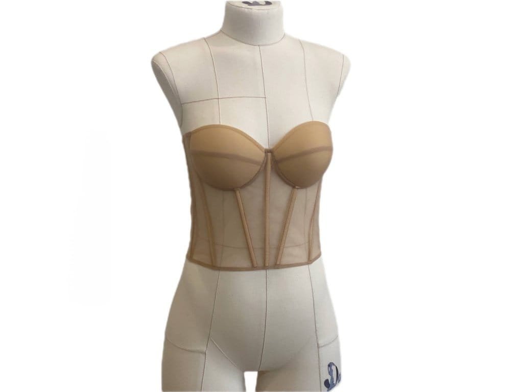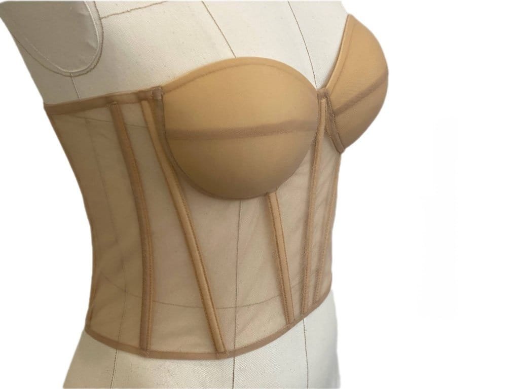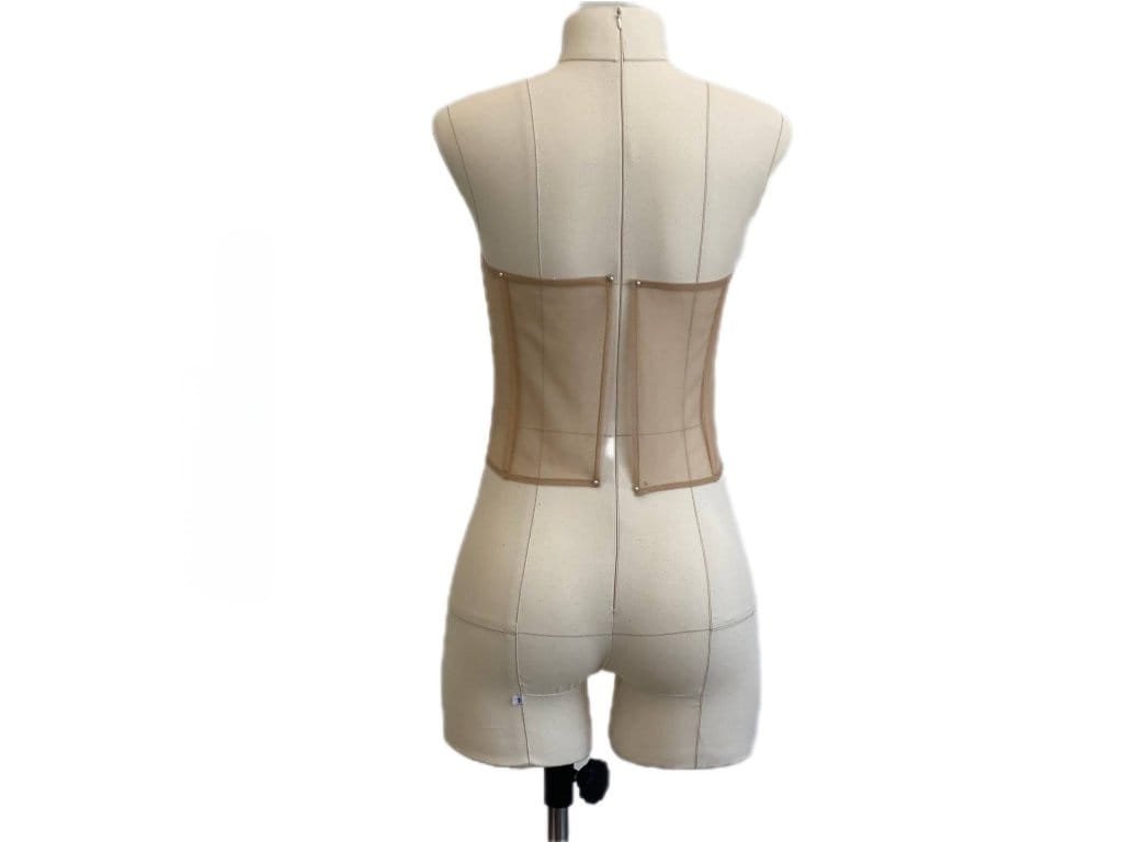 Tylový korzet v tělové barvě. Korzet je ušitý ze speciálního pružného tylu, je vyztužený kosticemi, které vypomáhají, ke správnému držení těla a vytvarovaní ženské siluety. Vzhledem k tomu, že korzet je polotovar, zadní díl je bez zapínání, na zadním díle je tyl připraven ke všití skrytého zipu nebo korzetových poutek dle vašich preferencí. Předchystaný korzet, který Vám ušetří spoustu času, dokonale se hodí pro společenské šaty, pro luxusnější vzhled doporučujeme ozdobit krajkou nebo krajkovou aplikací či kamínky...