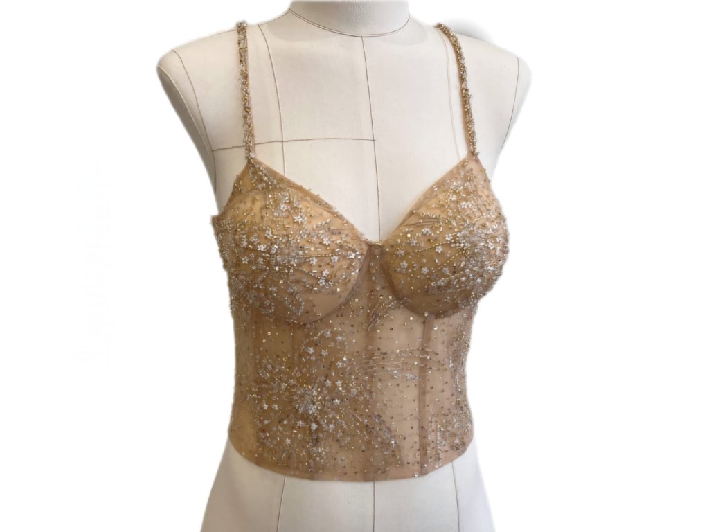 Korzet je ušitý ze speciálního tylu, vyztužený kosticemi, které pomáhají ke správnému držení těla a vytvarování ženské siluety. Korzet ručně zdobený luxusní krajkou ve zlaté barvě s květinovým motivem a korálky. Zadní díl je bez zapínání- Na zadním díle je tyl připraven ke všití skrytého zipu nebo korzetových poutek dle vašich preferencí. Korzet se dokonale hodí pro svatební a společenské šaty. Stačí došít sukni a šaty jsou hotové.